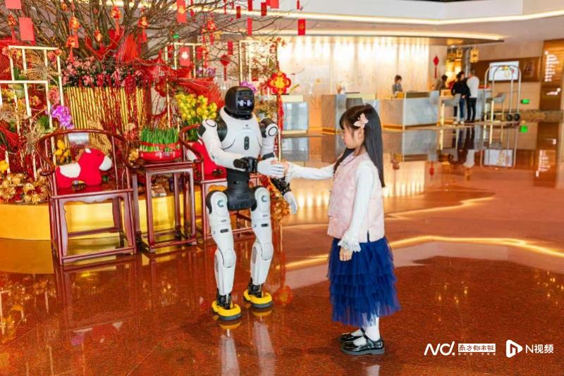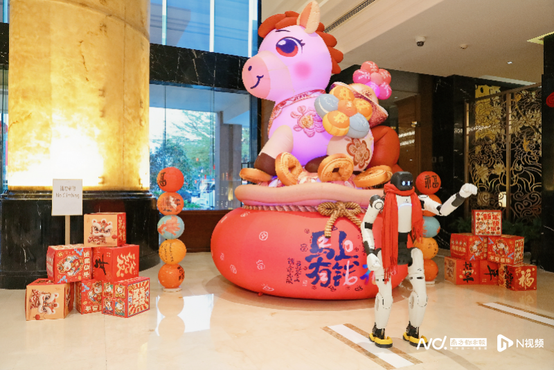 东方宾馆新年请来了智元灵犀,吸睛十足、亲和力满分,尤其是备受小朋友宾客的喜爱,不仅会跑步、跳舞、比心,还会与酒店大堂中高达四米的“马上有钱花”气球公仔互动,戴上红围巾扭动,即成为过年的喜庆氛围担当。