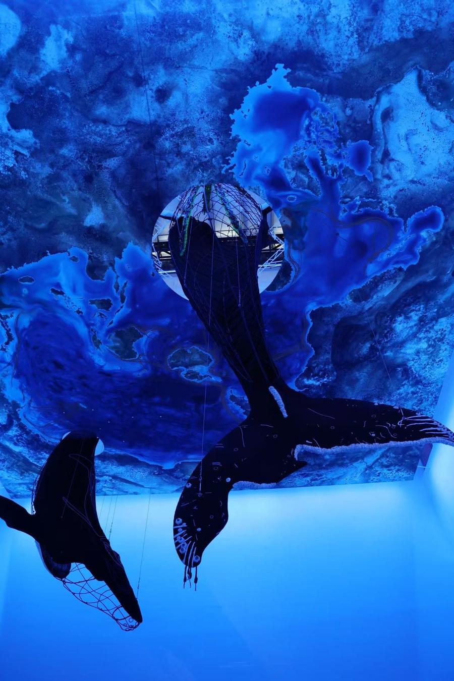春节前夕开放的“鲸鱼的致敬”艺术装置展,吸引许多观众在展厅的不同楼层、不同角落驻足。赵女士在3楼观展点停留许久,拍摄下灯光从暗转亮的过程,“大片大片的蓝,很震撼。”