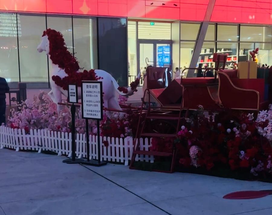 春节前的一个傍晚,记者来到浦东美术馆东侧小花园。中央水池周围环绕着花束,两侧分立着两匹骏马,马鬃以大红色的鲜花代替。往里走,四面墙上印着不同颜色的马头,分别写着“马上闪耀”“马上启程”等新春祝福语。