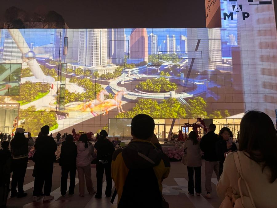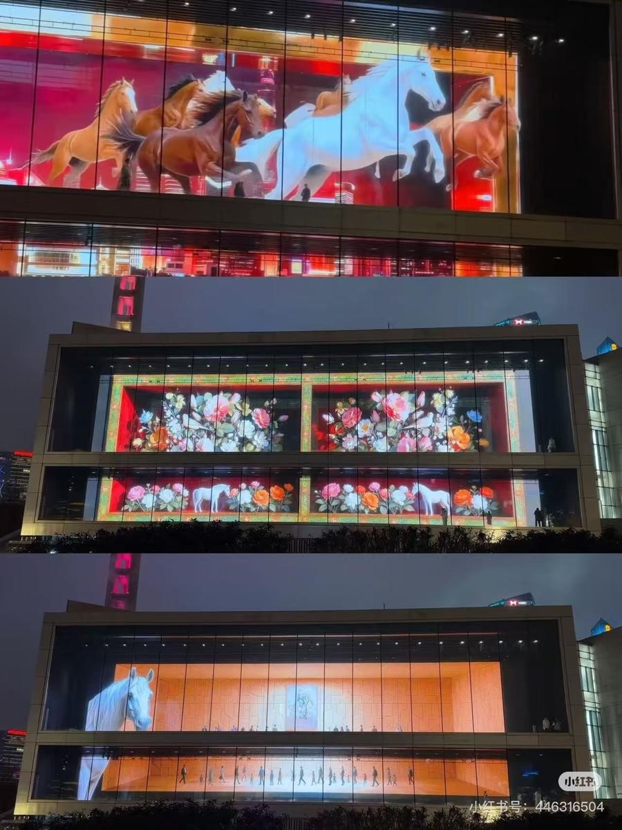 白天看展,晚上去哪里?两场光影秀,让不少观众表示,“可以多停留一会儿”。1月31日至3月3日(除夕暂停),“闪耀在浦美——马年迎春光影盛典”每晚在美术馆东侧外立面轮播。滨江侧,“一马当先 奋力一跳——浦东美术馆新春裸眼3D秀”则在镜厅“超长待机”,每天18时至22时轮播。