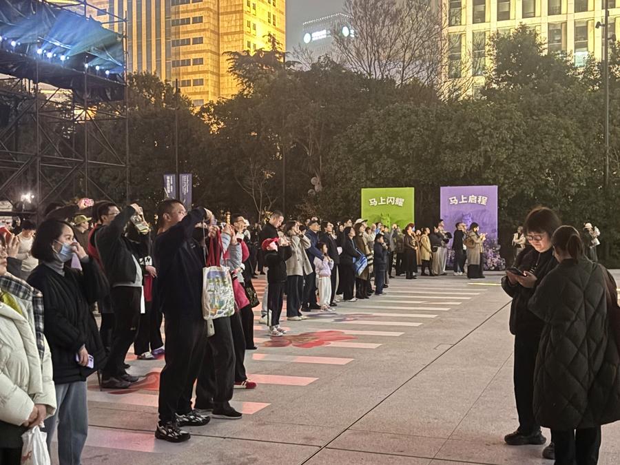 18时刚过,小花园里逐渐聚起观众。随着一段悠扬的爵士乐响起,“闪耀在浦美”光影秀拉开帷幕,蓝、黄、橙晕染的花体“2026”在2700平方米的墙面浮现。骏马从外滩天际线掠过,踏过万国建筑群的剪影,停留在浦东美术馆的屋顶。随后,它冲上云霄,在太空中与宇航员相遇,“马到成功”的横幅春联便在此刻展开。骏马俯身向下,迈入美术馆,穿行于“图案的奇迹”展厅。“夜莺与玫瑰”书籍装帧、诗会图釉面陶板上等卢浮宫展品接连亮相。而后,万马奔腾的场景以3D效果演绎,许多马背上都驮着大红色的新年礼盒,为观众送上新春祝福。8分钟的光影秀,不时有裸眼3D呈现,许多观众全程举着手机。现场观众杨先生表示,“又有送福、又有春联,还有刚才看过的展品,感觉层次很丰富。”