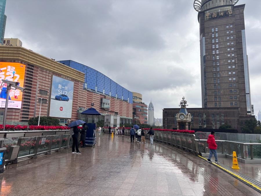 除夕上午,陆家嘴地铁站出口天桥,撑着伞的市民游客。阮佳雯 摄