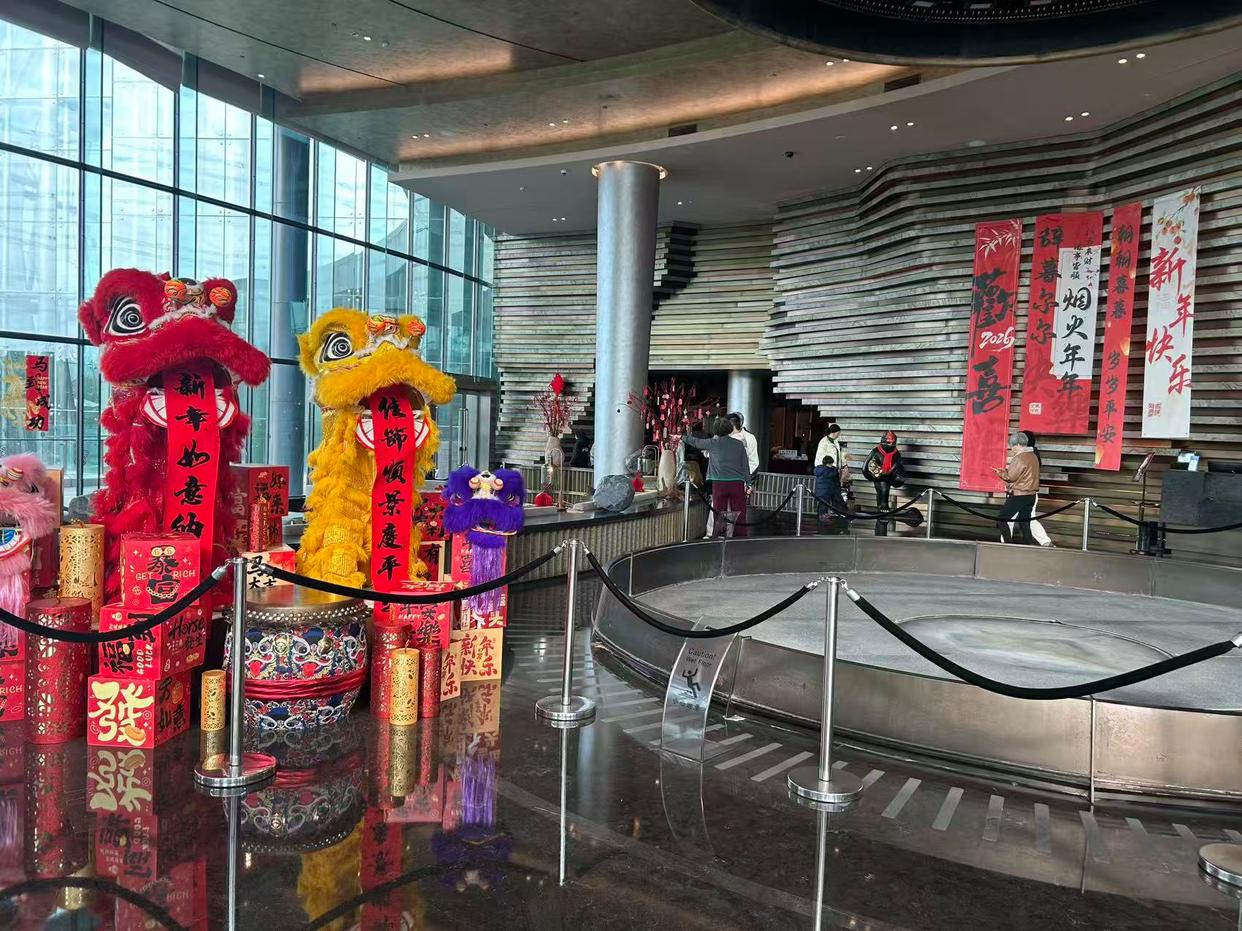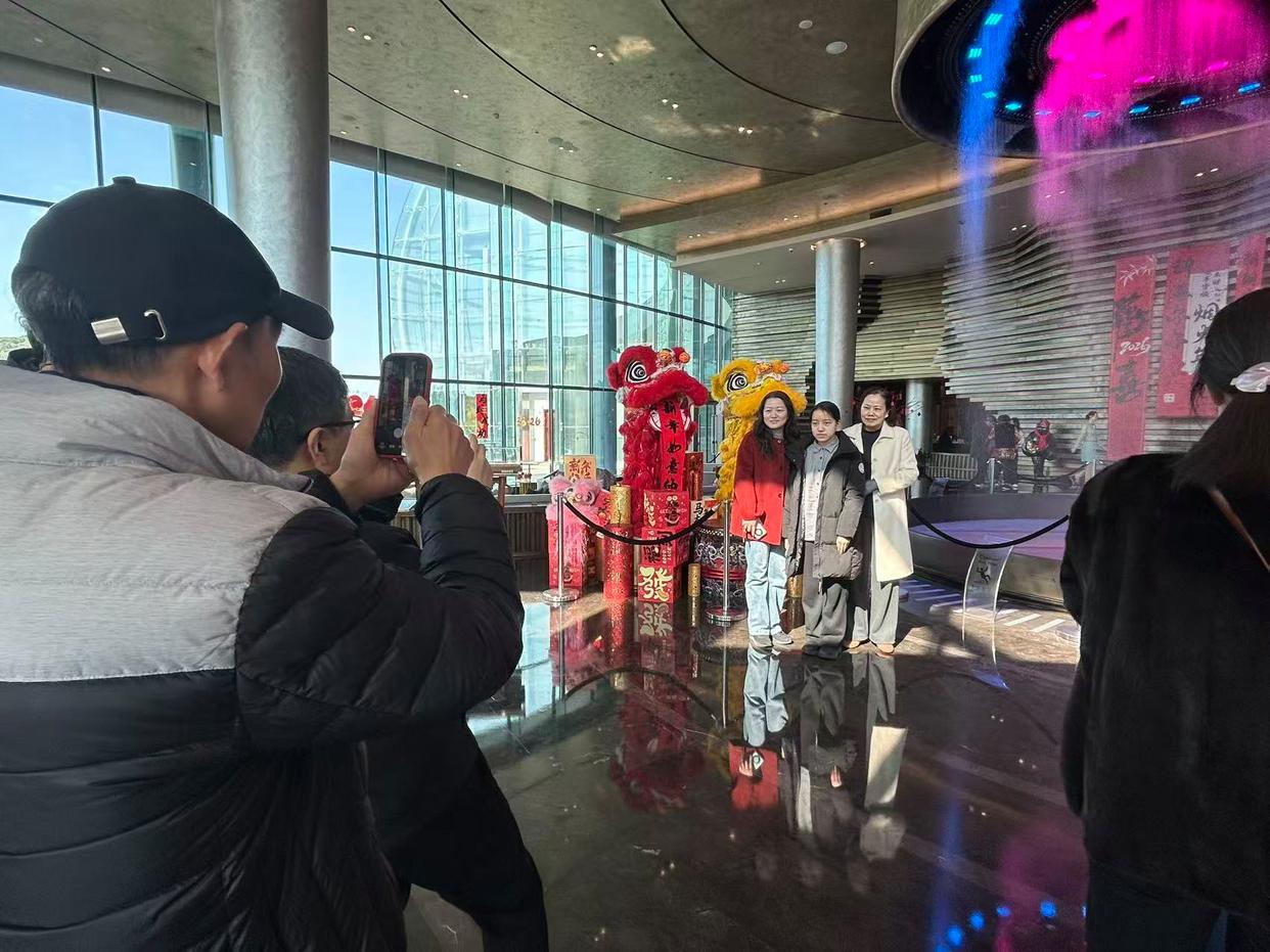 来自酒店的“惊喜”不止于此,只见迎宾区的工作人员身着中式旗袍微笑等待,手捧金元宝的“财神”在大堂与游客互动。随着阵阵锣鼓声响起,10时18分,当天的重头表演“瑞狮送福”拉开帷幕,两头雄狮踩着鼓点跳跃、搔首,不时与游客进行亲密互动,更展示了“吐福”绝技,将现场氛围推向高潮。来自俄罗斯的雪珂举着手机满脸激动地说:“这里太迷人了,活动遍布,还让我第一次看到舞狮表演,真的像是为外国人精心策划的。”