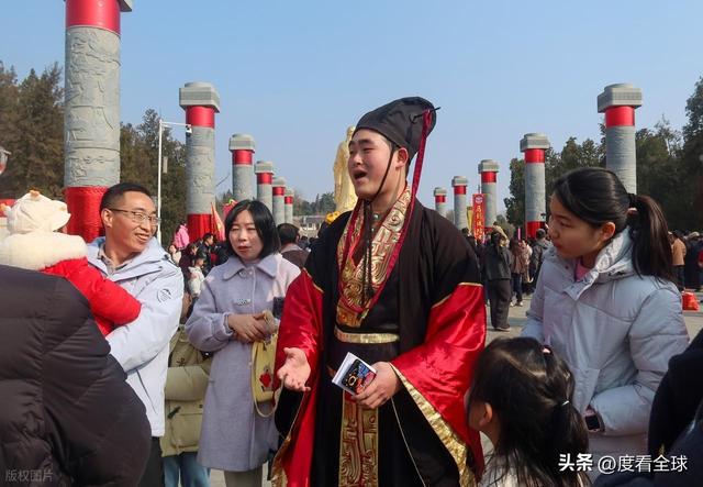 正月初一的函谷关,早已是一片欢腾的海洋。刚走进景区大门,就被一阵清脆的锣鼓声裹挟,身着传统服饰的表演者迈着欢快的步子,带着新春的喜气迎面走来。孩子们追着队伍奔跑,手里攥着五颜六色的气球,脸上的笑容比春日的阳光还要灿烂。不远处的广场上,《玄宗祭祖》《祭老仪式》等主题剧目正在上演,演员们身着古装,神情庄重又不失灵动,一举一动都复刻着千年之前的礼仪风貌,让游客在沉浸式体验中,感受着传统文化的博大精深。