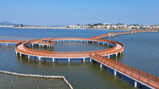 漫步海仔湖栈道上,感受渔村风情,欣赏滨海生态风光。这条全长1300米的“人”字形栈道将红树林观景与栈道慢行体验相结合,新春佳节和家人朋友于此漫步,温馨而惬意。