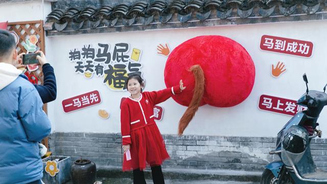 活动现场,融合生肖元素的“拍马屁”装饰成为最亮眼的打卡点。寓意吉祥的造型吸引众多游客举起手机,大家争相上前“摸一摸”,定格这喜庆的瞬间,祈愿新年“马到成功”。