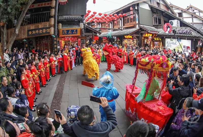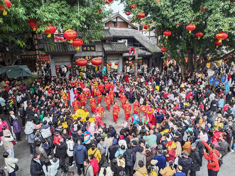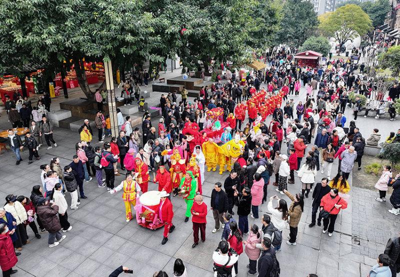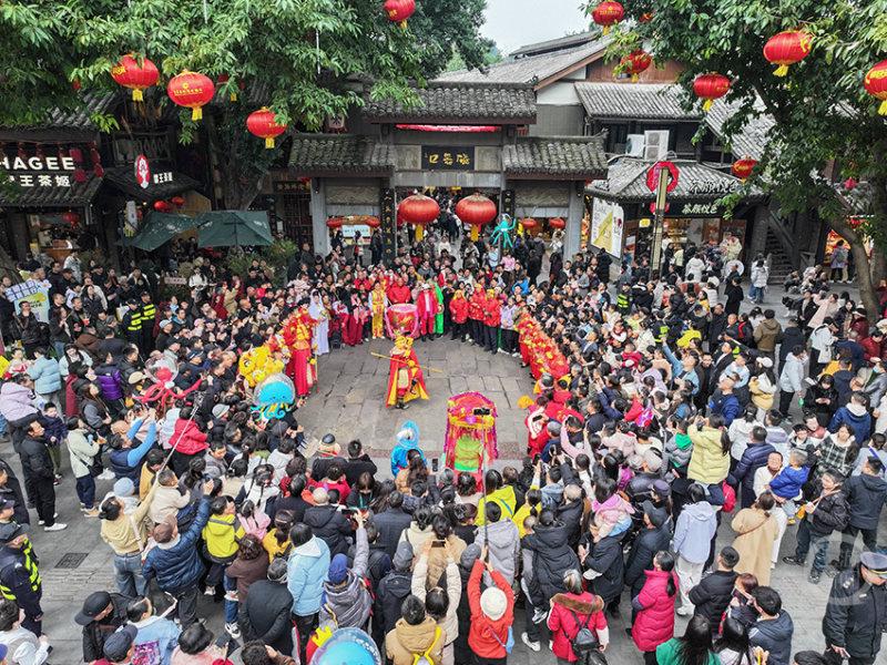 当天,磁器口古镇特别安排了舞狮巡游活动。随着喜庆热烈的鼓点,舞狮表演、划旱船、腰鼓表演等在穿梭的人流中精彩亮相,将民俗巡游带到游客身边。