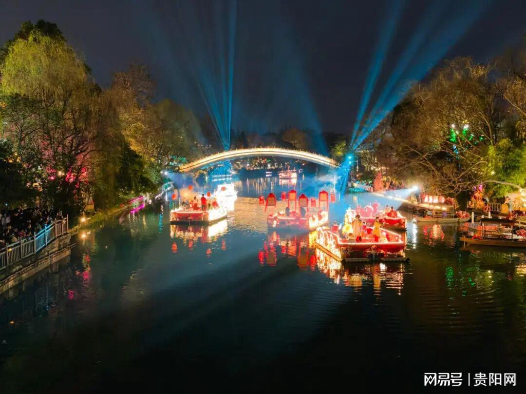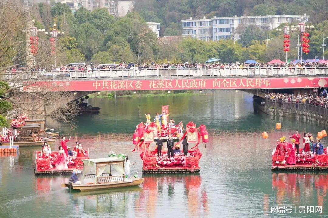 花溪河上,五艘主题花船缓缓穿行,以“马跃新程·福满乾坤”为叙事主线,除了船上精彩歌舞表演,还有“飞龙飞马”演出,再现“龙马共舞”的梦幻场景,实现“船在画中游,人在景中行”的意境。