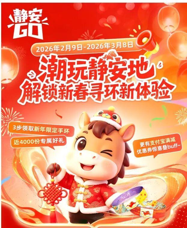 佩戴“静安go消费手环”,即可开启一场“潮玩寻环记”。它串联起全区文旅商体展多元场景,在手环合作商户处可轻松解锁专属折扣、积分加倍、限定赠品等多重惊喜福利,让你的静安新春之旅好玩又超值。