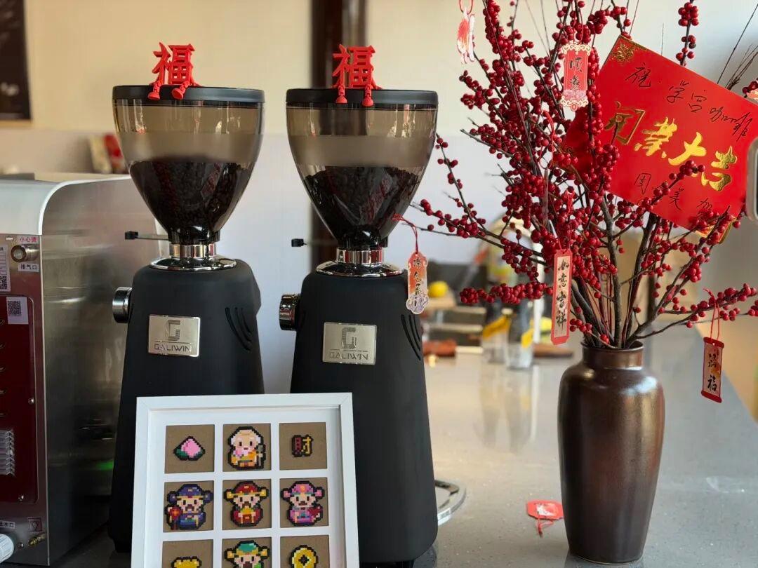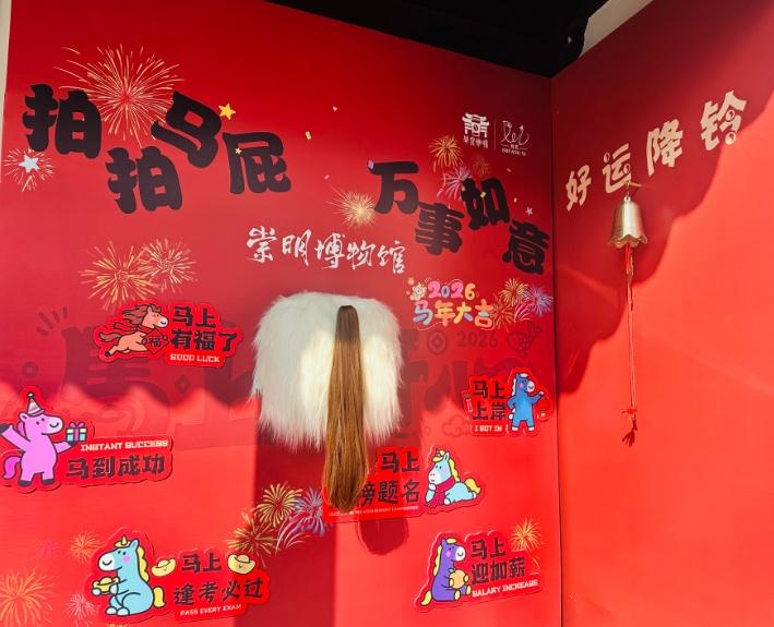 正值新春,咖啡馆门口特别设置了马年专属打卡点位。“拍马屁,好运铃”——在这里拍张照、摇响铃铛,寓意马年好运降临,万事顺遂。这份好意头,吸引了不少游客驻足打卡。走进馆内,年味扑面而来。红灯笼、福字贴、喜庆的装饰,让这方古韵空间洋溢着新春的暖意。
