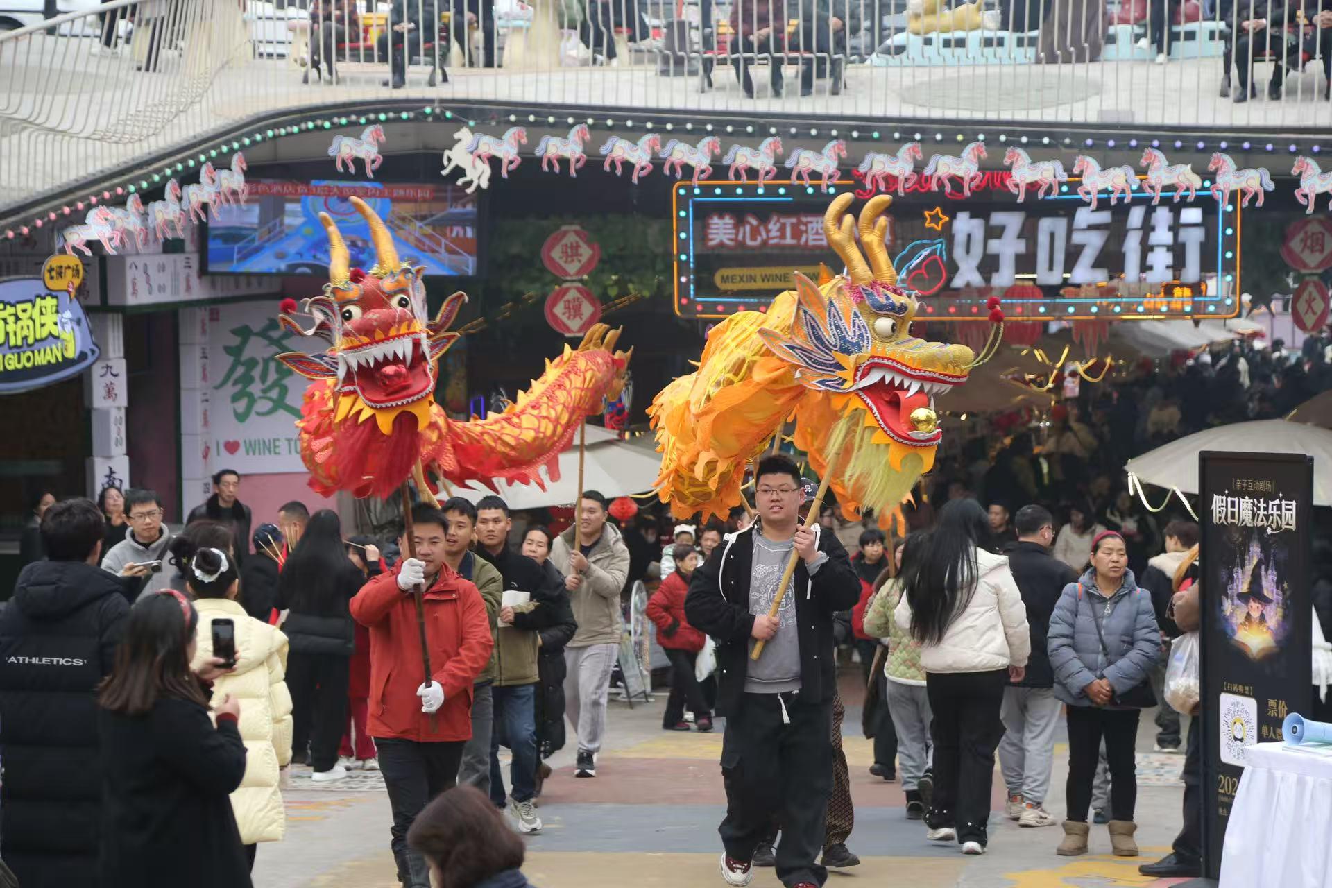 涪陵美心红酒小镇景区更是打破传统景区“台上表演、台下观看”的模式,全面转向以游客为主导,全民参与、沉浸式互动的新春玩法,把游客真正“宠”进浓浓年味里。除了舞龙舞狮、民俗巡游、财神送福等经典项目外,游客还可以穿戏服、持龙具、跟着鼓点一起巡游,亲身感受传统年俗的热闹与仪式感,从“围观者”变身“参与者”,让年味更足、欢乐加倍。15日至17日,景区人气持续火爆,日均接待游客超6万人次,成为重庆近郊新春出游的热门之选。