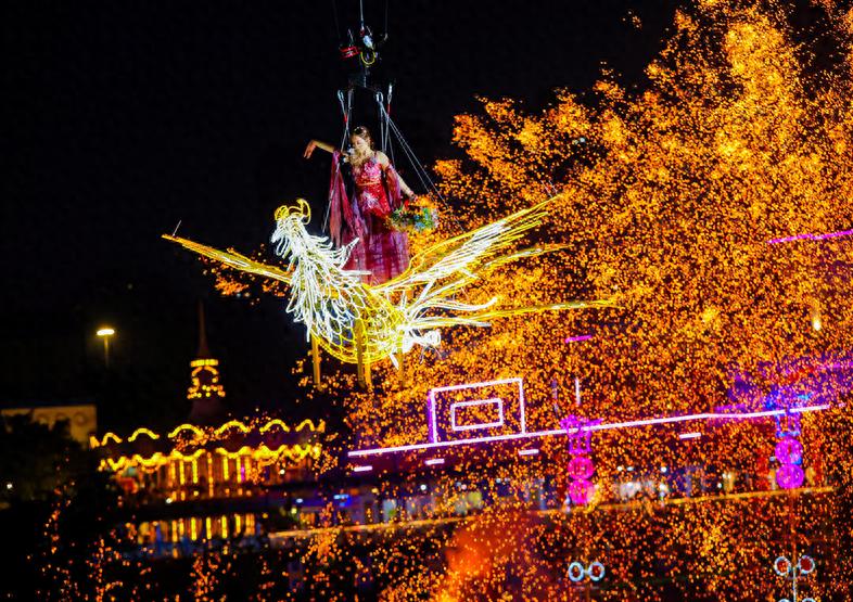 重庆欢乐谷举行了新春大妙会活动,集水陆空立体非遗大秀、百场非遗演艺、多种民俗互动、年味万福市集等于一体,以传统与现代碰撞的独特魅力为游客奉上沉浸式的地道年味体验。其中,非遗大秀在夜幕中璀璨亮相,1600℃的铁水挥洒成漫天花火,演员化身“天女”撒下花瓣雨,湖面的龙船、火凤凰、风火轮等装置火光绽放,光影成趣,水陆空一体联动,惊艳绝伦;川剧变脸、潮汕英歌舞、福建游神、电音三太子等百场非遗演艺,让游客可一站式领略全国传统文化魅力,吸引络绎不绝的游客前往。