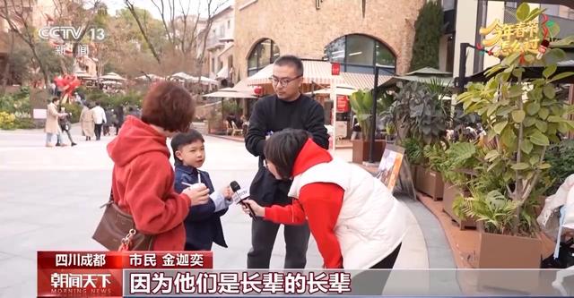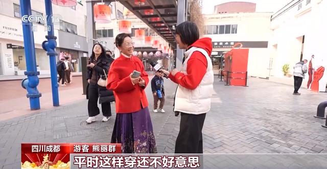 四川成都 游客 熊丽群:孩子说换个地方去过年。虽然换了一个地方,但还是在传承年味的,比如说我会穿上一件红衣服,因为春节喜庆,平时这样穿还不好意思,觉得过年就很好意思了。所以我觉得到哪里过年不是问题,都是用自己的方式传承年味。