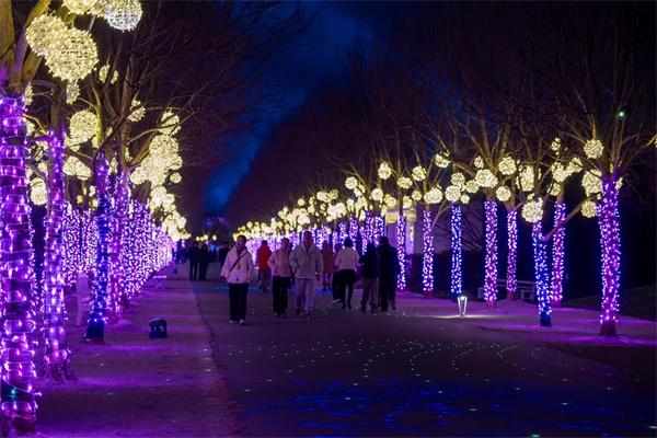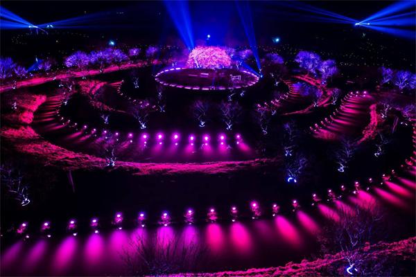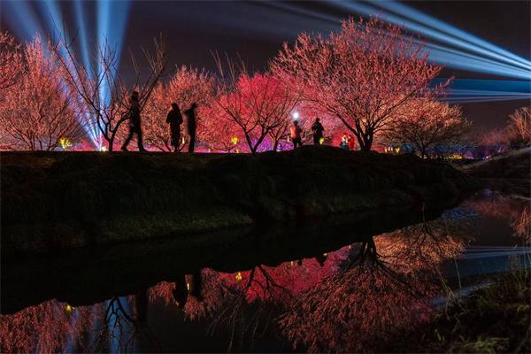 走进花开海上生态园,宫粉、朱砂、绿萼、美人梅、江梅等五大类60多个品种的梅花正值盛花期,漫步其间,暗香浮动,疏影横斜间勾勒出江南早春的诗意画卷。当暮色降临,白日的清雅梅园瞬间变身流光溢彩的梦幻世界。园区以梅园中心的“梅王”为圆心,在横跨200亩的梅林间铺展开一场声势浩大的光影盛宴,上千组多色LED帕灯与树灯点亮林间水岸,100瓦激光矩阵与500瓦电脑光束灯纵横交织,配合上千颗弹球灯点缀其间,在梅溪香岭、梅影曲径、梅宫探梅三大片区铺展出层次丰富的立体光域,整片梅林仿佛被光影重新雕琢。