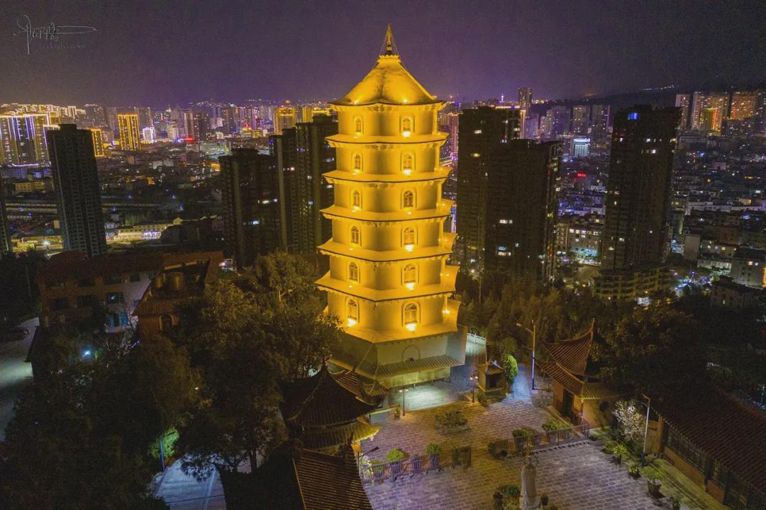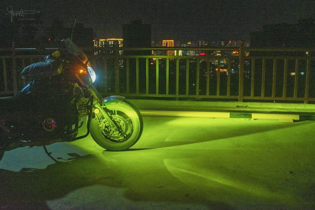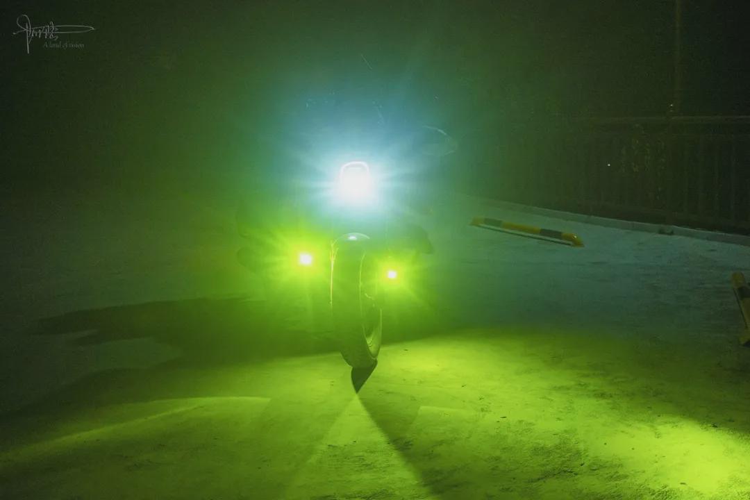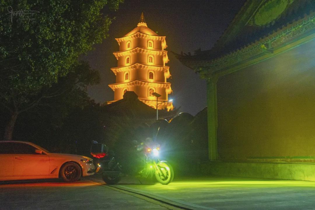 到目的地后按惯例骑着车前后左右一阵晃悠,出乎意料的是寺庙和佛塔竟然都没亮灯,于是特意找到自动补光并且开启监控模式的探头,对着塔身方向就是一通“数落” ,哈哈。也不知道是不是真被人听见了,反正没多久,它就浑身“染”上一层温暖的金黄光芒。