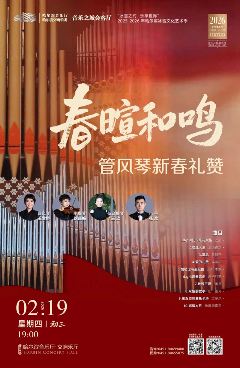 丙午马年新春,哈尔滨音乐厅从大年初一至初七,连续7天奉上7场高品质音乐会,弦乐、交响、管风琴、声乐、室内乐轮番登场,用世界经典与潮流旋律交织成新春礼赞。