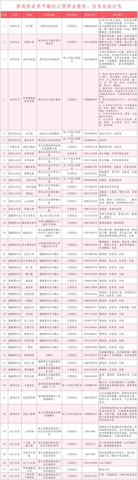 碧鸡街道四十余家餐馆、农家乐正常营业!