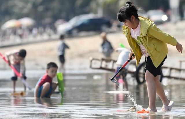 2月20日,小朋友在广西防城港金滩游玩。
