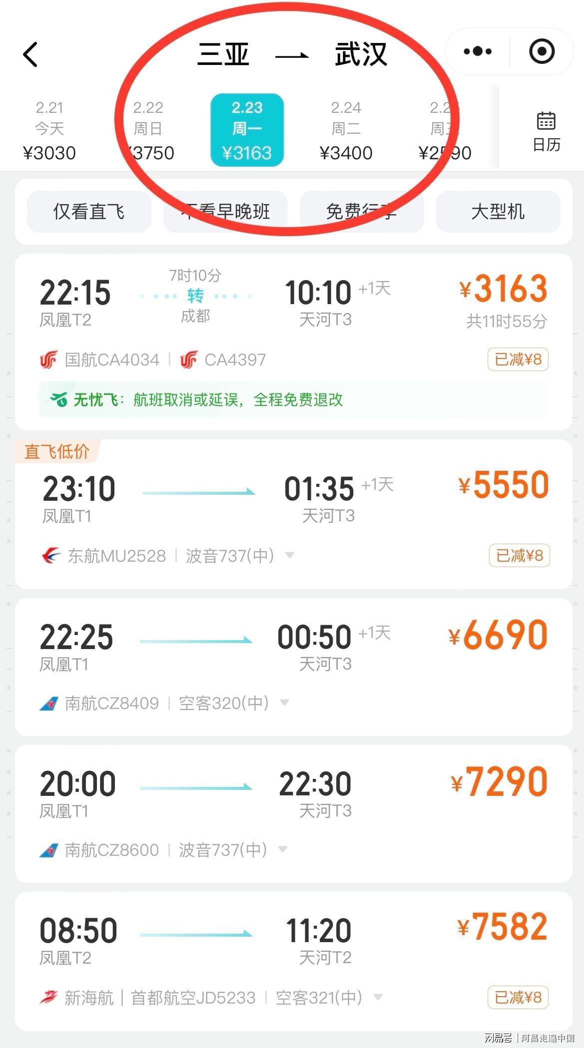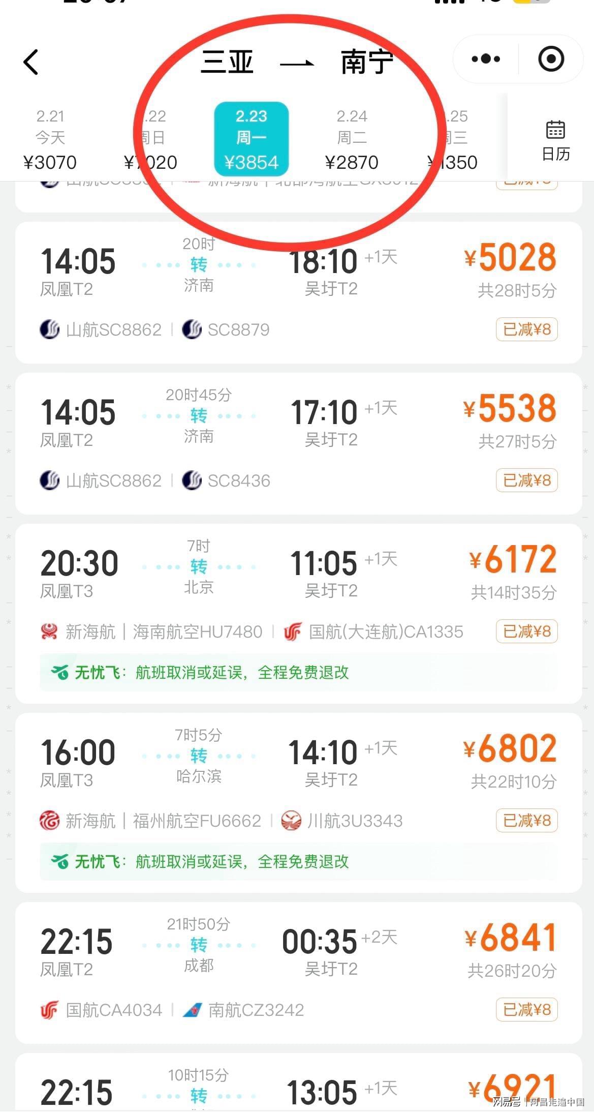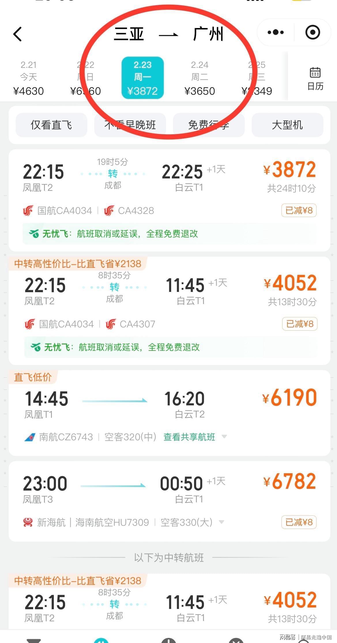 三亚、海口的机场,2月23号飞南宁,、武汉、广州,都在4000元至6000元之间。