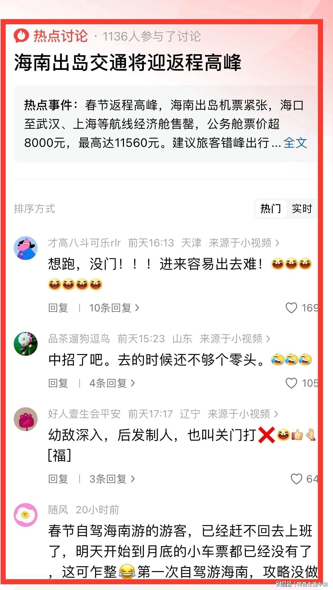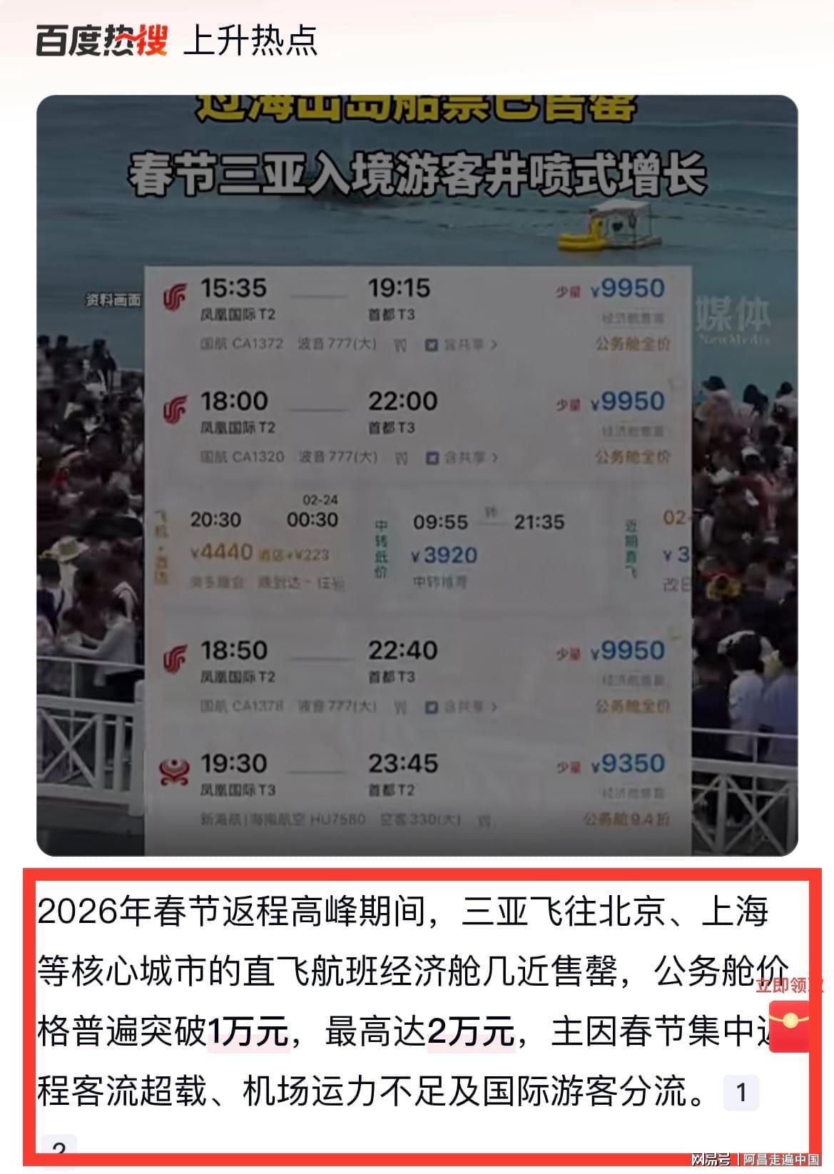 春节假期余额不多,大部分游客即将返程,然而海南整体机票上涨,冲上旅游热榜,什么叫瓮中捉鳖、关门打g,春节去三亚旅游的人,即将体验机票价格翻n倍的感受。