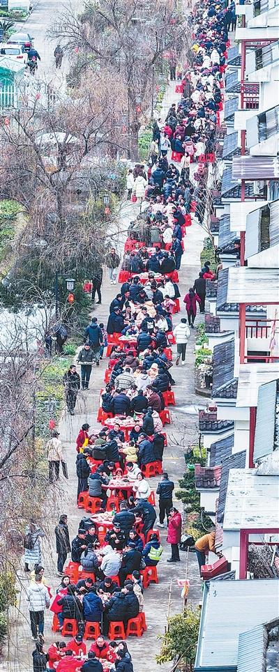 吃浙江建德市莲花镇戴家村,当地群众与外地游客品尝百家宴。新华社记者 徐 昱摄