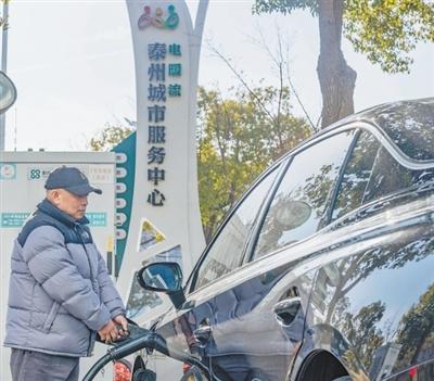 行我国建成全球最大电动汽车充电网络。这是一位车主在江苏泰州市的一个电动汽车快充站内为车辆充电。汤德宏摄(影像中国)