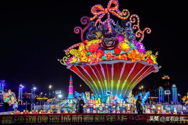 随着夕阳西下,夜幕缓缓降临,金沙滩啤酒城的灯会正式拉开帷幕。一瞬间,百余组灯组同时亮起,流光溢彩、璀璨夺目,将整个园区映照得如同白昼。原本静谧的海边园区,瞬间被灯光点燃,游人的欢呼声、赞叹声此起彼伏,与海风、音乐交织在一起,构成了一首热闹的新春交响曲。
