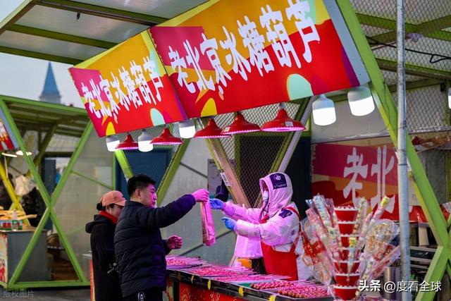 糖球摊位前早已排起了长队,红彤彤的糖球裹着晶莹剔透的糖衣,在灯光的映照下闪闪发光,山楂的酸、糖衣的甜,交织在一起,一口咬下去,酸甜可口,瞬间唤醒味蕾,这是刻在中国人骨子里的年味记忆。除了传统的山楂糖球,摊位上还有草莓糖球、山药豆糖球、橘子糖球等多种口味,满足不同游人的喜好,不少孩子牵着家长的手,踮着脚尖,期盼着能快点买到属于自己的那一串糖球。