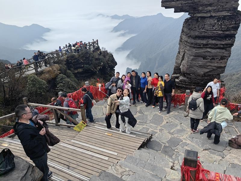 “大年初一登顶梵净山,真是一次特别棒的体验。”来自甘肃的杨女士对景区服务赞不绝口,她介绍,自己一行人从山脚下徒步登山,沿途每一处危险路段、转弯节点,都有工作人员贴心提醒,细致周到的服务让人倍感亲切、充满安全感,“山顶的风景更是不负期待,蘑菇石、老金鼎、红云金顶尽收眼底,雄伟壮观,让人沉醉。”