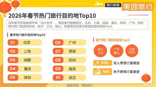 美团旅行数据显示,春节期间,宜宾文旅预订量同比增长56%,合肥增长30%。而义乌则跻身为春节文旅热度最高的县级市。据悉,义乌设置有10个“春晚同款”打卡点,吸引各地游客打卡留念。美团旅行数据显示,复原春晚美学场景的“西门老街”,搜索量超五倍。