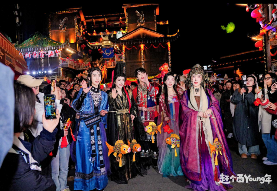 大年初四晚上,非遗火龙与百万粉丝古风NPC联袂上演迎新巡游,吸引了不少游客专程从外地赶来打卡。
