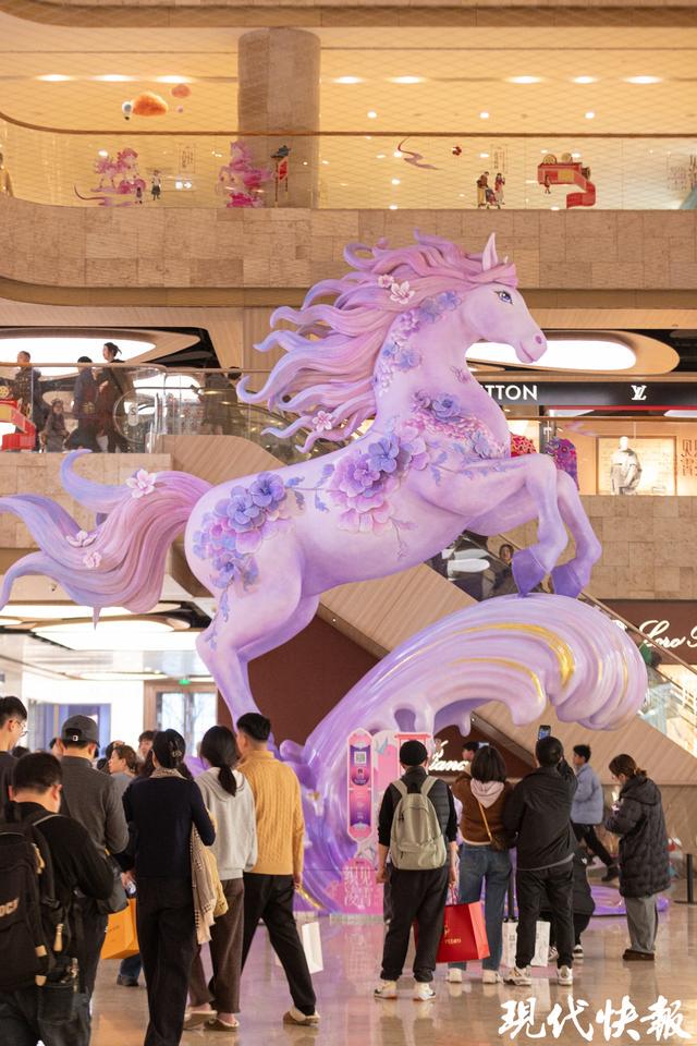 玄武的新春还透着“科技范儿”。德基广场内,“凌霄”天马艺术装置成为整座城市的新晋地标。7.2米高的骏马尾鬃以全手工彩线编织,梅花点染其间。游客们举着手机寻找最佳角度,镜头里,AR骏马从虚实交界处踏云而来,与装置构成时空交叠的奇观。
