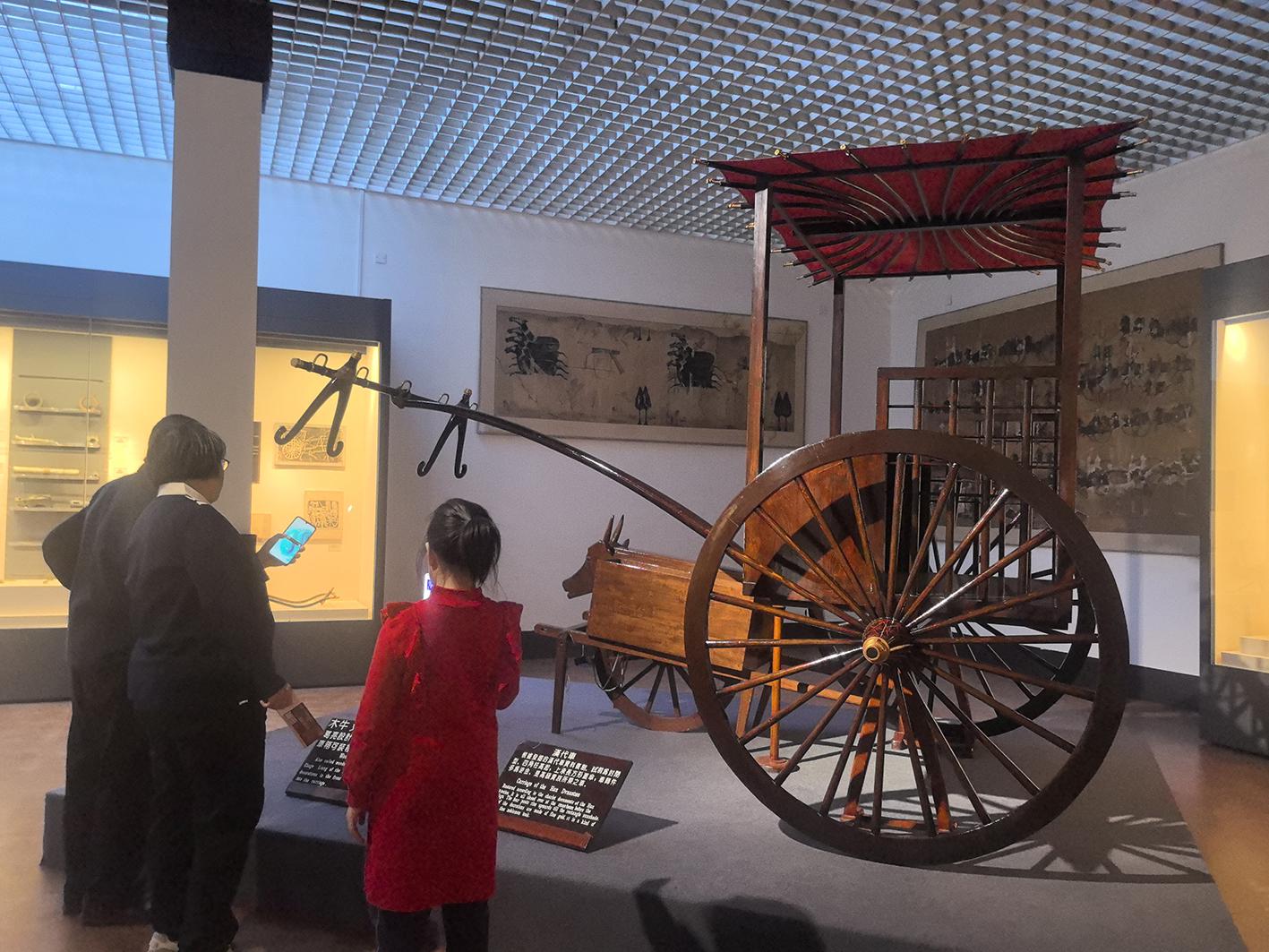 观众在参观博物馆内陈列的复原汉代车 李佳霖 摄