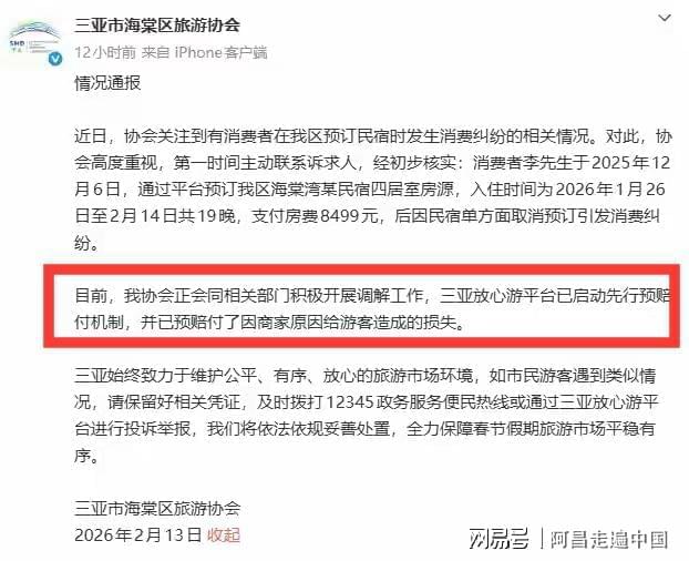 游客李先生把事情投诉到三亚旅游协会,2026年2月13日,海棠湾旅游协会发文,三亚放心游平台已启动先行预賠付机制,并已预赔付了因商家原因给游容造成的损失,并启动调查。