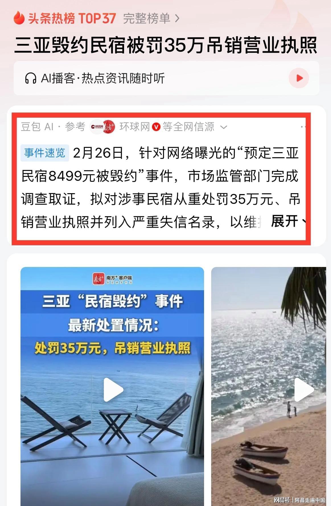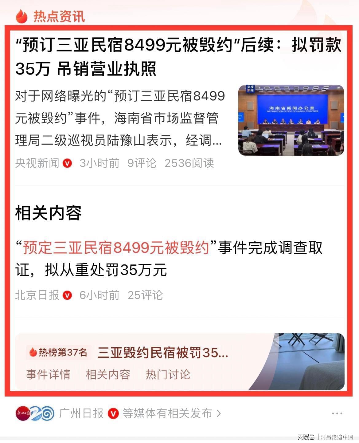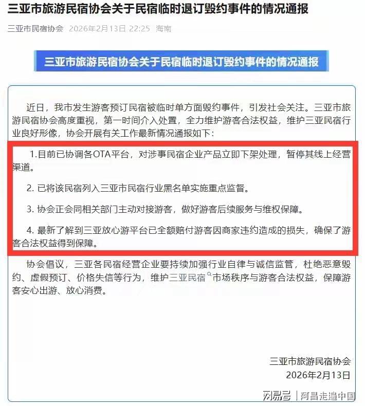 2026年2月26日,根据央视报道:网络曝光的“预订三亚民宿8499元被毁约”事件,海南省市场监督管理局二级巡视员陆豫山表示,经调查取证,认定该民宿经营者涉嫌未履行合约,损害消费者合法权益,依法拟给予从重处罚35万元,吊销营业执照,列入严重失信名录。