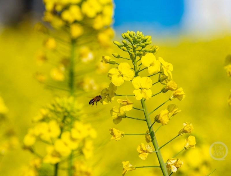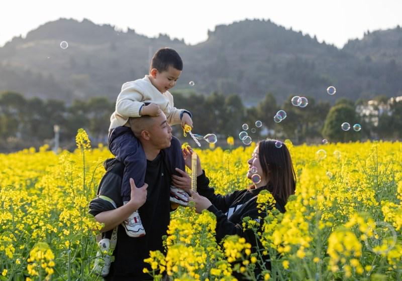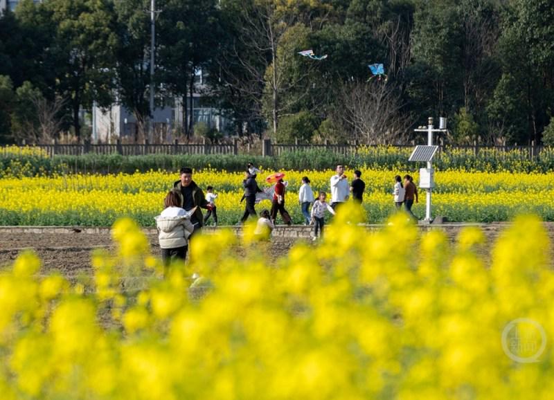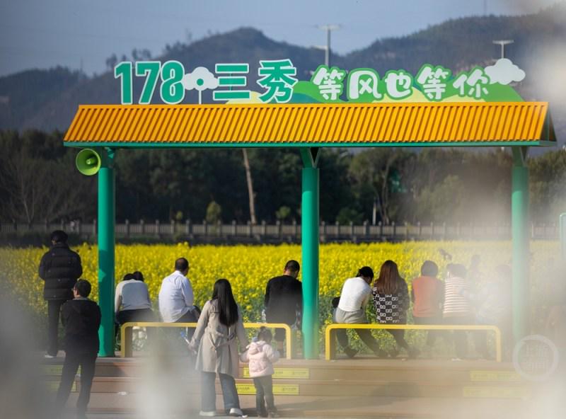 近日,重庆市南川区东城街道三秀社区,油菜花竞相绽放,金色的花海与远山、民居相映成趣,吸引众多市民游客前来踏青赏花。