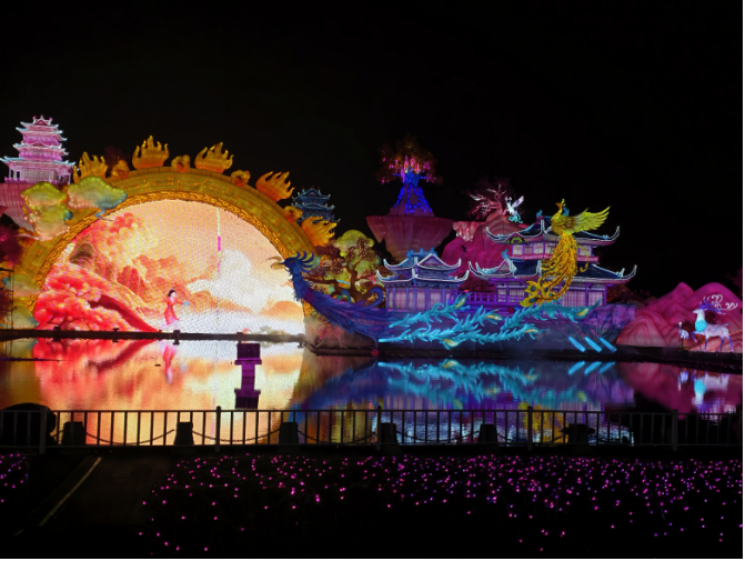 在本届厦门园博苑灯会中,大型水上灯组沿湖铺展,水面倒影与舞台光影形成视觉呼应。陆地主题舞台与流动式演出区域穿插布局,使游客在移动过程中自然进入不同演艺场景。
