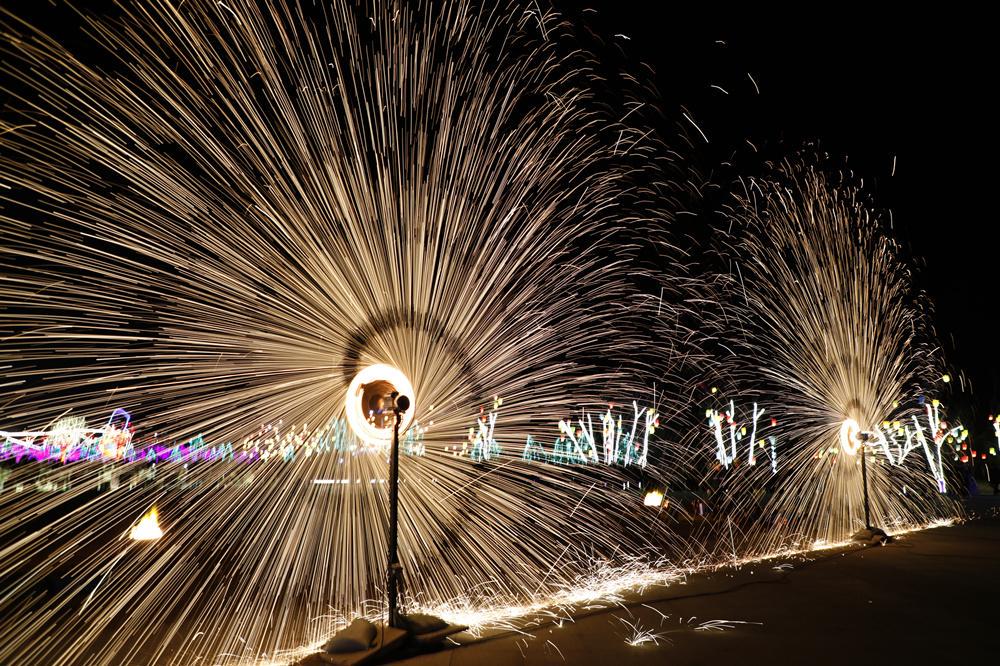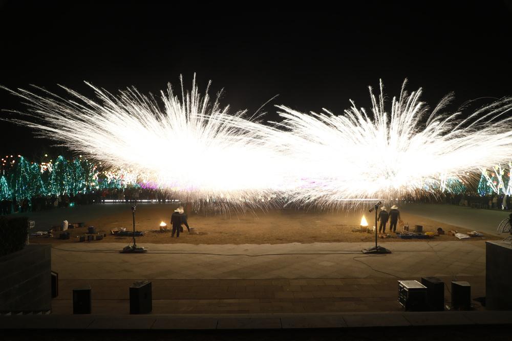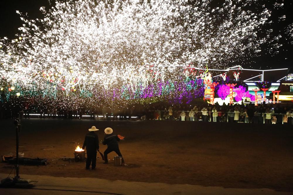 夜幕降临,遗址公园内的第四届灯光艺术展成为最亮眼的风景线。一组组融合考古遗址、古人类生活场景的彩灯次第点亮,三维激光投影让山间光影跳跃,“祈福神树”流光溢彩,蝴蝶秋千荧光闪烁,仿佛穿越百万年时光隧道。孩子们追着灯影奔跑嬉戏,大人们纷纷与光影中的考古符号合影,60岁的本地游客王大叔感慨道:“在家门口能看灯光秀,还能了解咱泥河湾的考古故事,太好了!”晚8时,掇树花、九龙炮、炭花舞等非遗民俗表演准时开演,炽热的铁花在夜色中绽放,与灯光交相辉映,打造出“考古+灯光+民俗”的奇幻场景,吸引游客驻足喝彩,手机快门声此起彼伏。