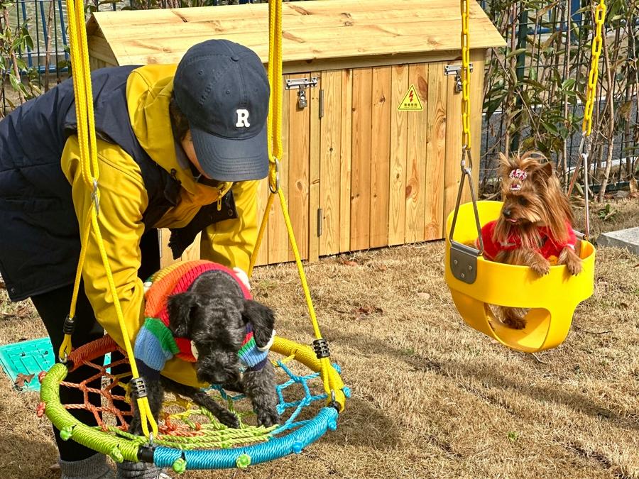 游乐区分为大型犬区和中小型犬区,柔软的真草皮充分考虑宠物活动的舒适性与安全性秋千等趣味游乐设施一应俱全,宠物饮水器、拾便袋箱等也备齐,还为“铲屎官”们设置了休息座椅。露营区则配备了大片草坪和专门的栓狗桩,养宠家庭可以在此搭帐篷,与爱宠一同享受惬意的户外时光。