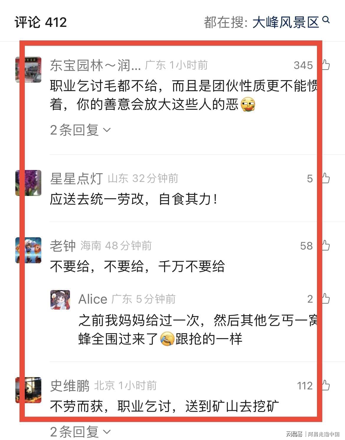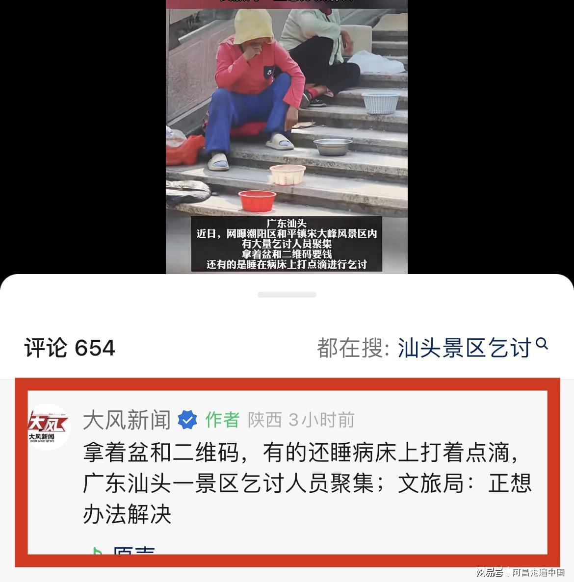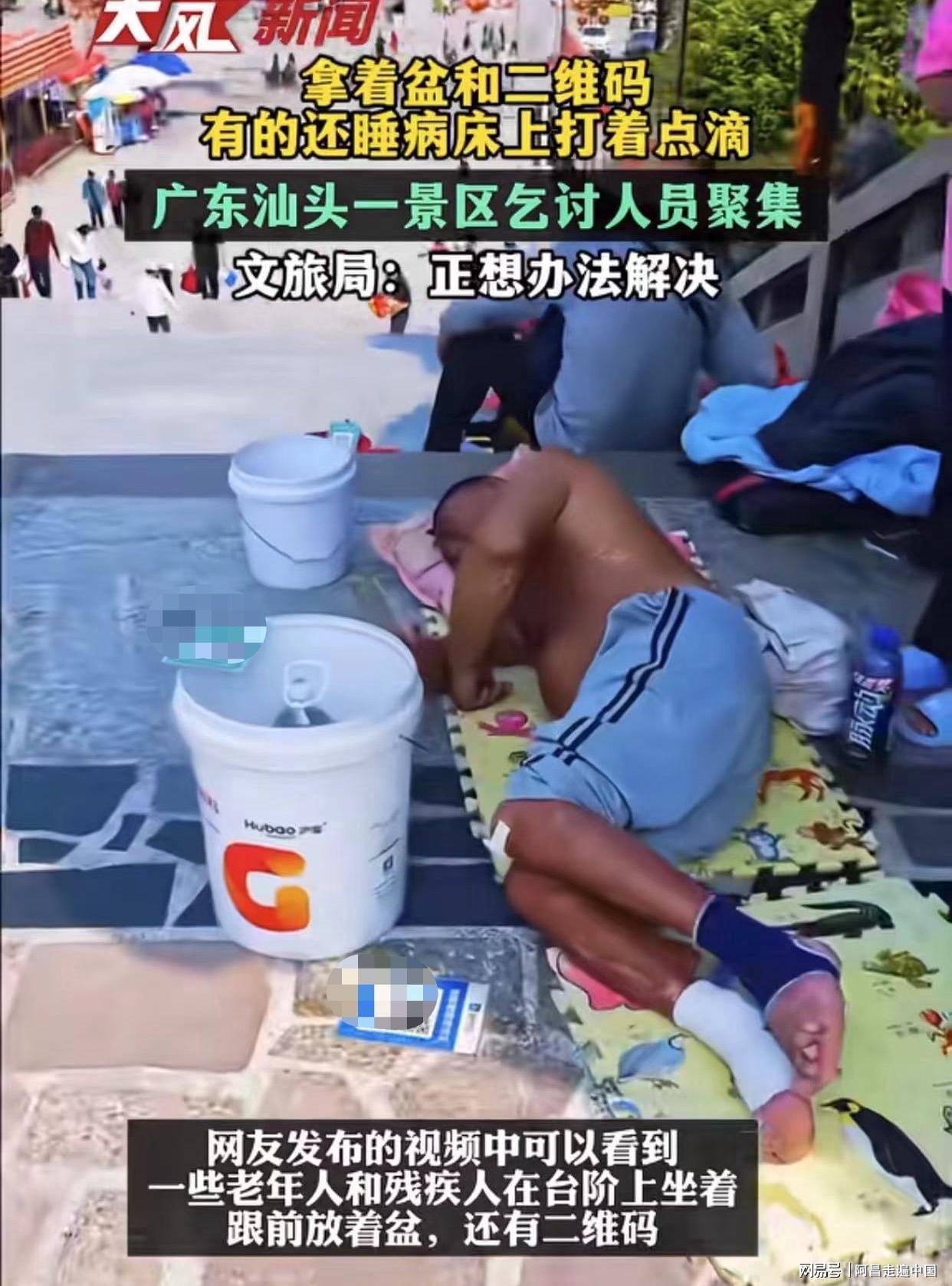 根据大风新闻报道:广东汕头潮阳区和平镇宋大景区入口一路上全是老弱病残拿着盆、二维码、乞讨,有的睡在病床上,有游客准备对着乞讨的人拍照,乞讨人就阻止拍,说你拍又不给钱,拍什么拍。