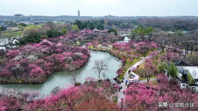 瘦西湖的湖上梅林,如今已是江苏新晋三大赏梅胜地之一,也是长三角地区少见的“水陆相映”赏梅盛境。这片占地150亩的梅林,汇集了宫粉、绿萼、朱砂、江梅等数十种精品梅花,近万株梅树依水而植,错落分布,瘦西湖水蜿蜒穿林而过,形成了“岸上有梅、水中有影”的独特景致。站在观梅台上远眺,整片梅林灿若云霞,层层叠叠的梅花覆盖了起伏的岗地,再现了清代扬州“二十四景”之一“平冈艳雪”的绝美神韵。