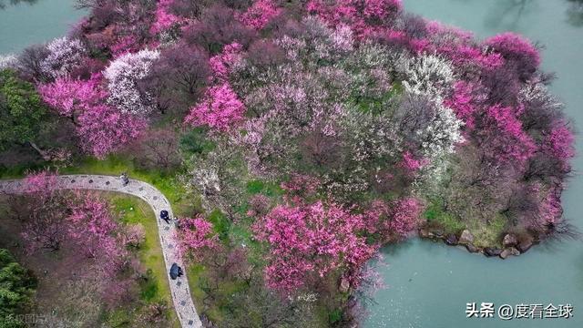 岸边,游人撑着各色雨伞,踏着湿润的青石小径,缓缓穿行在梅林深处。有人驻足花下,静静凝视花瓣上滚动的雨珠,任由梅香混着湿润的空气,漫过鼻尖、萦绕心头;有人举着手机,定格花影映雨的瞬间,想把这份春日限定的浪漫,永久留存;还有人乘一叶扁舟,顺着蜿蜒的湖水穿行,看梅枝斜倚湖面,花影倒映碧波,桨声轻摇间,落英随风飘入水中,随波逐流,活成了“疏影横斜水清浅”的诗意实景。