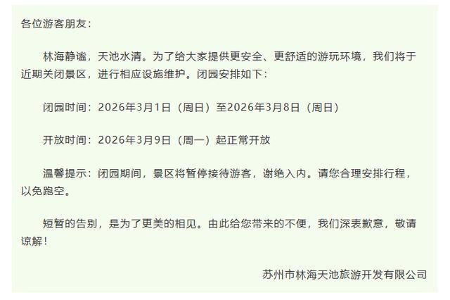 日前,位于吴江区的林海天池景区发布闭园公告,具体如下: