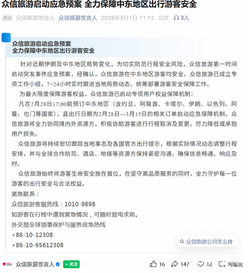 众信旅游表示,凡在2月28日17:00前预订中东地区(含约旦、阿联酋、卡塔尔、伊朗、以色列、阿曼、也门等国家),且出行日期为2月28日至3月15日的相关订单启动应急保障机制。