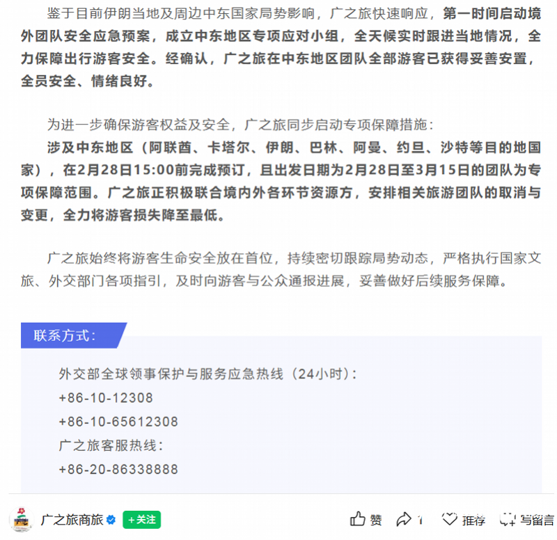 鉴于近期伊朗及周边安全局势的变化,广之旅商旅3月2日发文表示,已第一时间启动境外团队安全应急预案。经确认,广之旅在中东地区团队全部游客已获得妥善安置,全员安全、情绪良好。