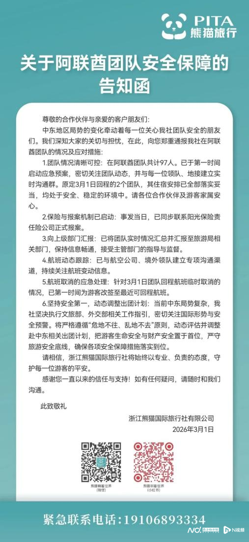 熊猫旅行3月1日发文称,目前在阿联酋的97名团队成员情况清晰可控,均处于安全稳定的环境中。原定于3月1日回程的2个团队,住宿安排已全部落实妥当,均处于安全稳定的环境中。