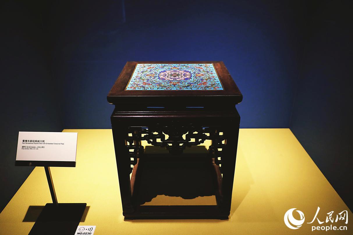 紫檀木嵌珐琅面方机。人民网记者 李唯一摄