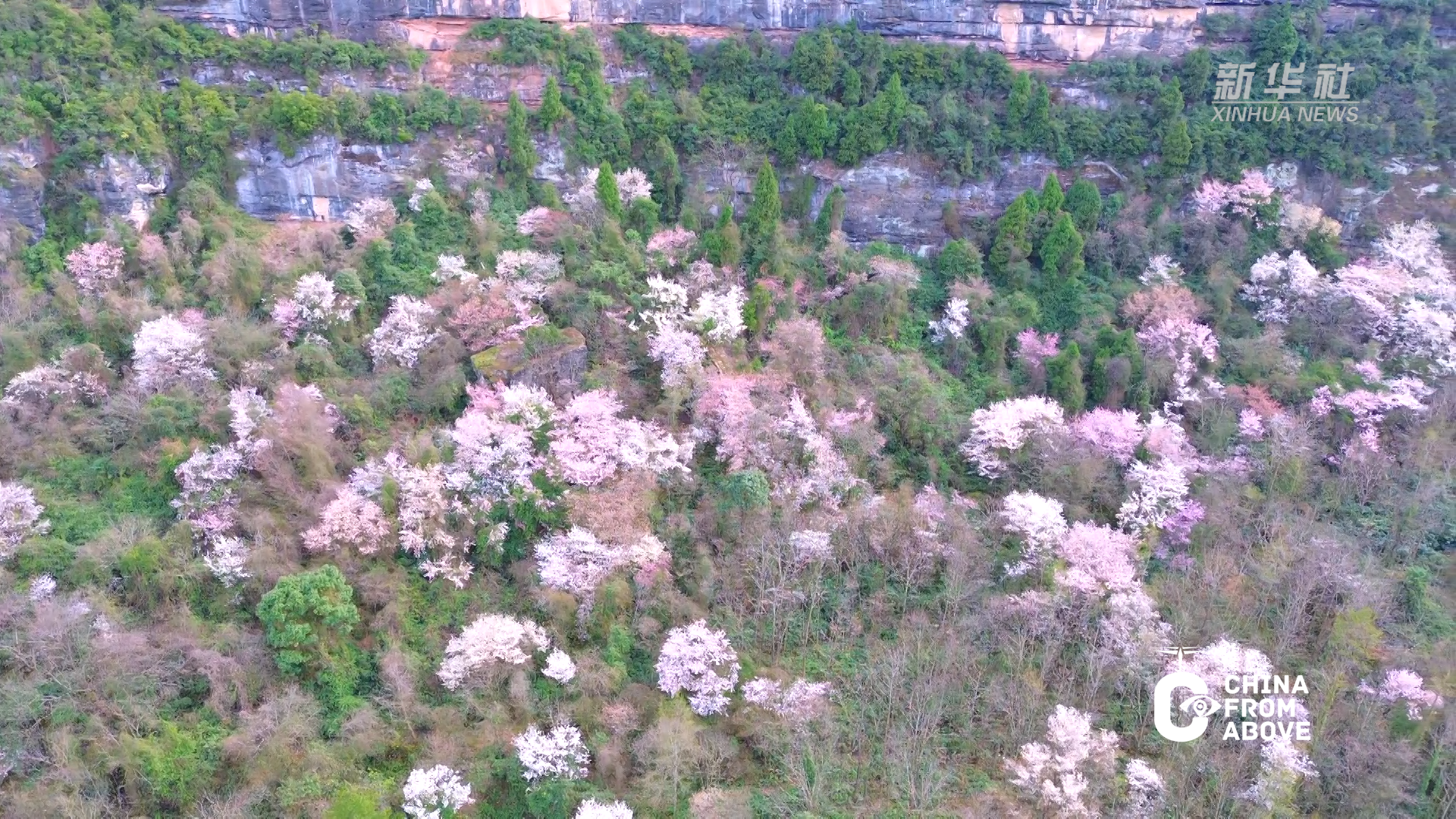 放眼望去,一树树野樱花粉白相间,灿若云霞。它们或簇拥成团,或傲然独立,镶嵌在苍松翠柏的墨绿底色与百米悬崖的险峻线条之间。山风拂过,枝头摇曳,花瓣纷扬如雨,空气中弥漫着清雅的芬芳。整个山谷,在此刻化作了一首无声的诗,一幅流动的画。