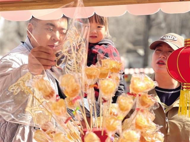 市民在五泉山公园游玩时挑选画糖。 张婧 摄