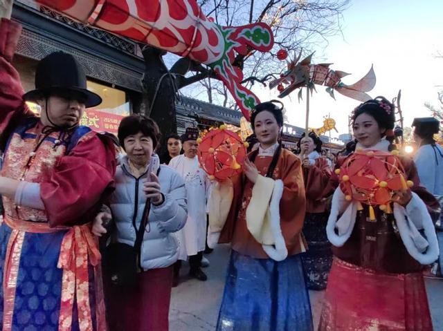 元宵节当晚,身着古装汉服的演员,手持锦鲤、鳌鱼等传统工艺鱼灯,提灯沿街区核心路线巡游,打造“鱼龙舞千年”的诗意夜游盛景。巡游途中还设置了传统滚灯舞表演,经典民俗舞蹈与古街夜景相融,为夜游增添别样韵味。现场市民游客不约而同地跟着巡游队伍游街,古街瞬间摩肩接踵,热闹非凡。